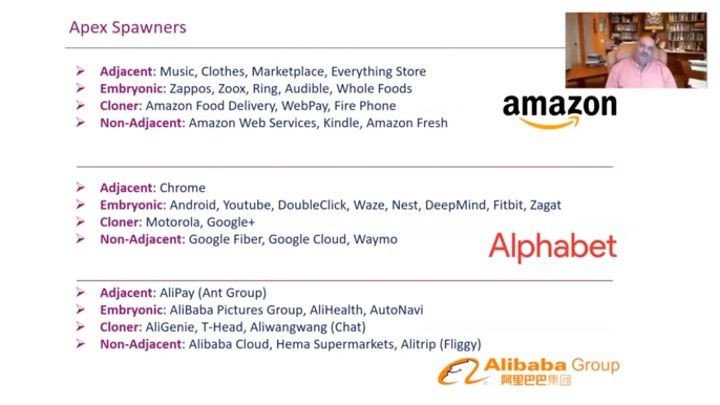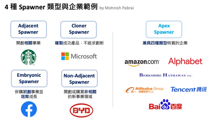 Pabrai 在影片中也提到了幾間 Apex 類型的公司,可以參考影片中分享的投影片來看這幾間公司分別在上述四種 Spawning 方式做了哪些嘗試,有些成功,有些失敗,但重要的是他們還是會持續在不同事業領域中開創和發展,以保有成長動能。